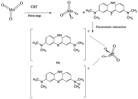 It was found that the removal of MB by α-MoO3 nanoparticles was by adsorption mechanism. In fact, the FTIR spectroscopy indicated that the removed MB cations caused by adsorption process, without chemical decomposition of MB and no intermediate compounds were detected. In addition, the increase on the effectiveness of the removal of MB using α-MoO3 nanoparticles by increasing the pH until 11 could be attributed to the basic media. From this establishment, a mechanism could be suggested (Figure 14). In fact, in the first step at pH = 11, the positive charge of the MB is maintained since its pKa is equal to 3.8 [77]. In addition, the hydroxyl groups (OH−) in the solution react with α-MoO3 to produce the ion molybdate (MoO42−) without intermediate compounds [95]. Thus, the adsorption is governed by strong electrostatic interactions between the negatively surface charge of molybdate (MoO42−) and the positively charged MB cations.