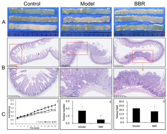 - Li, D.; Zhang, Y.; Liu, K.; Zhao, Y.; Xu, B.; Xu, L.; Tan, L.; Tian, Y.; Li, C.; Zhang, W.; et al. Berberine inhibits colitis-associated tumorigenesis via suppressing inflammatory responses and the consequent EGFR signaling-involved tumor cell growth. Lab. Investig. 2017, 97, 1343–1353. [Google Scholar] [CrossRef] [PubMed]