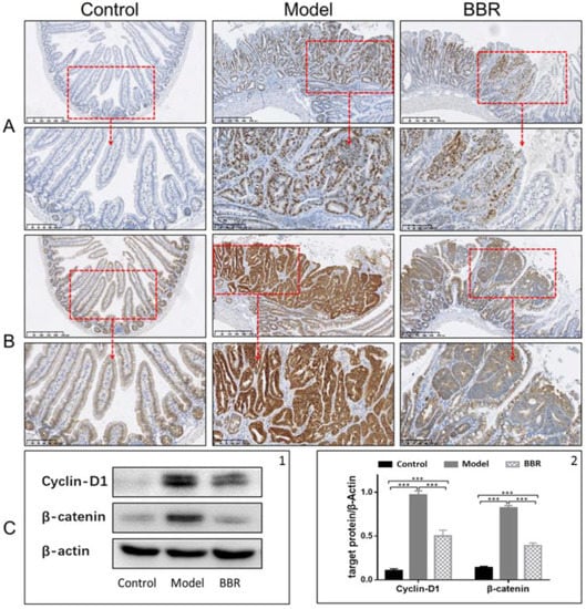 In order to investigate the effect of BBR on tumor formation in Apc min/+ mice, the mice were either treated or not treated with BBR for 12 weeks. The food intakes were similar in all groups. The bodyweight changes are shown in Figure 1C-1 and Figure S2. The weights of wild-type mice fed a standard diet (NCD) increased by approximately 10 g after the 12-week period, while the weights of the Apc min/+ mice in the HFD group had higher increases of approximately 17 g. In contrast, BBR treatment obviously attenuated the increase in bodyweight. Meanwhile, after treatment with BBR, the tumor number and tumor load were significantly reduced (Figure 1A,C-2,C-3). A histological analysis of the tissues from the Apc min/+ mice fed with an HFD showed that compared with normal crypts, their crypts were dysplasic, and their adenomas appeared with nuclear hyperchromasia and increased nucleus-to-cytoplasmic ratios (Figure 1B). However, in the BBR-treated group, these changes were greatly improved. Furthermore, immunohistochemistry and Western blot analysis showed that the expressions of cyclin D1 and β-catenin were upregulated in the Apc min/+ mice fed with an HFD, while their expressions in BBR-treated mice were significantly reduced (Figure 2A–C). All of these results indicate that BBR could attenuate carcinogenesis in Apc min/+ mice fed with an HFD.