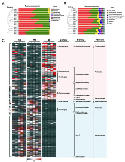 Effects of BBR on the gut microbiota compositions among the three groups. (A) Bar plot comparing the phyla compositions of different groups superposed on the clustering tree. (B) Bar plot comparing the genera compositions of different groups superposed on the clustering tree. (C) Heatmap visualizing the relative abundance of the detected top 127 predictive operational taxonomic units (OTUs). The red color represents high abundance, while the dark color represents low abundance. The labels on the right represent the taxonomy of each OTU. C5: samples from wild type mice fed with a standard diet after 12 weeks; M5: samples from Apc min/+ mice fed with a high fat diet after 12 weeks; B5: samples from Apc min/+ mice fed with a high fat diet supplemented with BBR after 12 weeks.