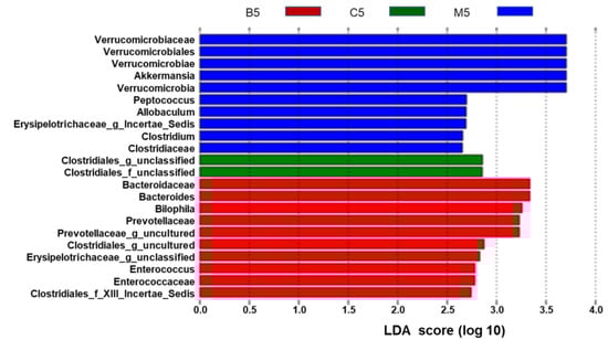 Different structures of gut microbiota among the three groups. The ten blue bars represent the ten microbial communities in the model group that are significant different from those in the control and BBR groups. The two green bars represent the two microbial communities in the control group that are significant different from those in the model and BBR groups. The ten red bars represent ten microbial communities in the BBR group that are significantly different from those in the control and model groups—the higher the linear discriminant analysis (LDA) score, the more important the role of the microbiota in a particular group.