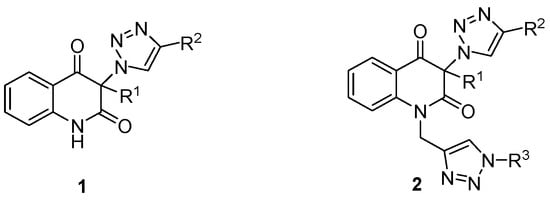The 1,4-disubstituted-1,2,3-triazole heterocyclic motif has become an exceedingly popular structure finding applications in a broad range of areas including materials, biomaterials, metallopharmaceuticals, supramolecular chemistry, chemical sensing and catalysis, to name just a few []. In coordination and organometallic chemistry, for example, it became an important ligand scaffold, not only because of simplicity and reliability in its preparation, but also due to a variety of coordination modes offering [,,,,]. Owing to the discovery of copper(I)-catalyzed 1,3-cycloaddition of terminal alkynes with organic azides, the CuAAC click reaction, the preparation of 1,4-disubstituted-1,2,3-triazole is facilitated in mild and modular fashion [,]. Although this “click triazole” has become a part of a broad range of molecules, its association with quinoline-2,4-diones remains largely underdeveloped. Apart from our recent publication on 3-(1H-1,2,3-triazol-1-yl)quinoline-2,4(1H,3H)-dione derivatives (1, Figure 1) [], to the best of our knowledge, other 1,2,3-triazole functionalized quinoline-2,4-diones are unprecedented.