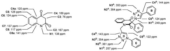 The 13C and 15N chemical shifts for triazole rings A and D (Table 5 and Table 6) are in a good agreement with those reported previously [].