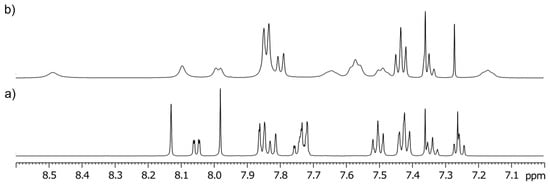 Aromatic region of 1H NMR spectra of: (a) 2b in CDCl3, and (b) a mixture of 2b (42 mM) and [RuCl(μ-Cl)(η6-p-cymene)]2 (21 mM) in CDCl3 immediately after dissolution.
