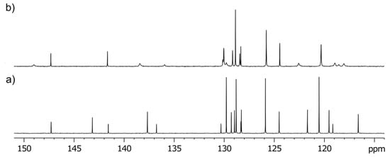 Aromatic region of 13C NMR spectra of: (a) 2b in CDCl3, and (b) a mixture of 2b (42 mM) and [RuCl(μ-Cl)(η6-p-cymene)]2 (21 mM) in CDCl3.