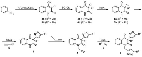 We reasoned that the desired bis(1,2,3-triazole) functionalized quinoline-2,4-diones 2 could be obtained via previously described 3-(1H-1,2,3-triazol-1-yl)quinoline-2,4(1H,3H)-dione derivatives 1 as synthetic intermediates (Scheme 1). The latter were prepared in a four-step reaction sequence starting from aniline, which upon treatment with diethyl 2-methylmalonate and diethyl 2-phenylmalonate initially afforded the corresponding 4-hydroxyquinolin-2(1H)-ones 3a and 3b []. Chlorination with sulfuryl chloride into 3-methyl- and 3-phenyl-3-chloroquinolin-2,4(1H,3H)-diones 4a [] and 4b [], followed by the nucleophilic displacement of the chlorine atoms with sodium azide, gave 3-methyl- and 3-phenyl- substituted 3-azidoquinoline-2,4(1H,3H)-diones 5a and 5b []. Then we began with copper-catalyzed azide-alkyne cycloaddition reaction (CuAAC).