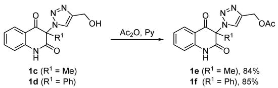3.6. General Procedure for the Synthesis of (1-(2,4-Dioxo-1,2,3,4-Tetrahydroquinolin-3-yl)-1H-1,2,3-Triazol-4-yl)Methyl Acetates 1e,f (Scheme 2)