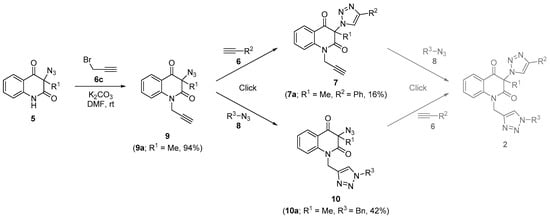In principle, the “click-propargylation-click” reaction sequence at 3-azidoquinoline-2,4-diones 5 could be altered, providing the target bis-(1,2,3-triazole) functionalized products 2 via bifunctional azidoethynyl quinoline-2,4-dione intermediate 9 as shown in Scheme 3. This would allow orthogonal sequential synthetic strategies for accessing bis(1,2,3-triazole) functionalized materials []. We briefly explored this possibility by treating 3-azido-1-propargylquinoline-2,4-dione derivative 9a with phenylacetylene (6a) or benzyl azide (8a) under the above mentioned CuSO4/Cu0/DMF conditions. The corresponding monotriazoles 7a (16%) and 10a (42%), respectively, were obtained in moderate yields.