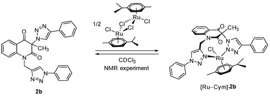 Reaction of 2b with [RuCl(μ-Cl)(η6-p-cymene)]2 with tentatively proposed structure of the [Ru–Cym]-2b complex.