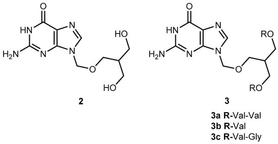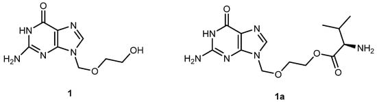 - Colla, L.; De Clercq, E.; Busson, R.; Vanderhaeghe, H. Synthesis and antiviral activity of water-soluble esters of acyclovir [9-[(2-hydroxyethoxy)methyl]guanine]. J. Med. Chem. 1983, 26, 602–604. [Google Scholar] [CrossRef] [PubMed]