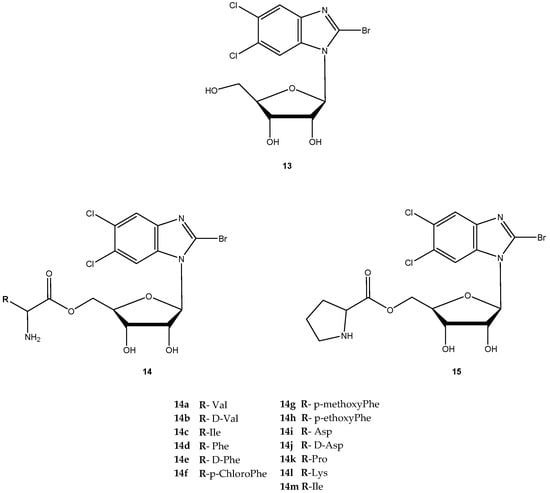 - Zou, R.; Drach, J.C.; Townsend, L.B. Design, synthesis and viral evaluation of 2-chloro-5,6-dihalo-1-(β-d-ribofuranosyl)-benzimidazoles as potential agents for human cytomegalovirus infection. J. Med. Chem. 1997, 40, 811–818. [Google Scholar] [CrossRef] [PubMed]