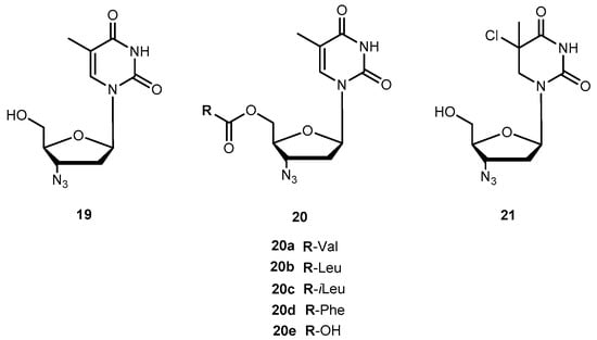 - Turk, G.; Moroni, G.; Pampuro, S.; Briñon, M.C.; Salomón, H. Antiretroviral activity and cytotoxicity of novel zidovudine (AZT) derivatives and their relation to their chemical structure. Int. J. Antimicrob. Agents 2002, 20, 282–288. [Google Scholar] [CrossRef]
