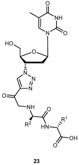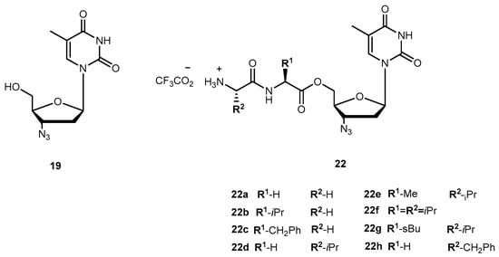- Santos, C.; Capela, R.; Pereira, C.S.; Valente, E.; Gouveia, L.; Pannecouque, C.; De Clercq, E.; Moreira, R.; Gomes, P. Dipeptide derivatives of AZT: Synthesis, chemical stability, activation in human plasma, hPEPT1 affinity, and antiviral activity. ChemMedChem 2008, 3, 970–978. [Google Scholar] [CrossRef] [PubMed]