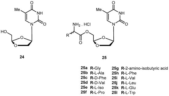 - Liang, Y.; Sharon, A.; Grier, J.P.; Rapp, K.L.; Schinazi, R.F.; Chu, C.K. 5’-O-aliphatic and amino acid ester prodrugs of (−)-β-d-(2R,4R)-dioxolane-thymide (DOT): Synthesis, anti-HIV activity, cytotoxicity and stability studies. Bioorg. Med. Chem. 2009, 17, 1404–1409. [Google Scholar] [CrossRef] [PubMed]