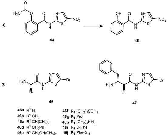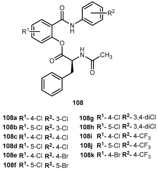 - Krátký, M.; Vinšová, J.; Butcha, V.; Horvati, K.; Bösze, S.; Stolaříková, J. New amino acid esters of salicylanilides active against MDR-TB and other microbes. Eur. J. Med. Chem. 2008, 45, 6106–6113. [Google Scholar] [CrossRef] [PubMed]