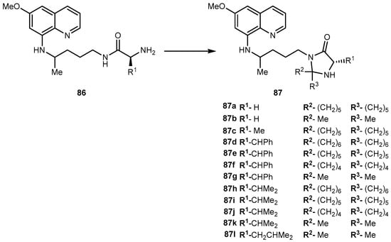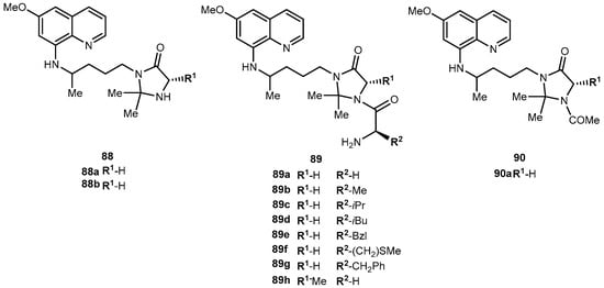 - Vale, N.; Matos, J.; Gut, J.; Nogueira, F.; do Rosário, V.; Rosenthal, P.J.; Moreira, R.; Gomes, P. Imidazolidin-4-one peptidomimetic derivatives of primaquine: Synthesis and antimalarial activity. Bioorg. Med. Chem. Lett. 2009, 18, 4150–4153. [Google Scholar] [CrossRef] [PubMed]