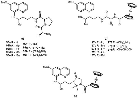 - Vale-Costa, S.; Vale, N.; Matos, J.; Tomás, A.; Moreira, R.; Gomes, P.; Gomes, M.S. Peptidomimetic and organometallic derivatives of primaquine active against Leishmania infantum. Antimicrob. Agent Chemother. 2012, 56, 5774–5781. [Google Scholar] [CrossRef] [PubMed]