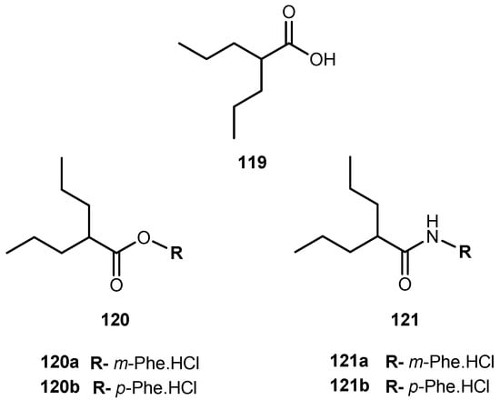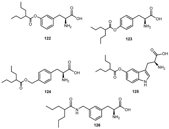 - Peura, L.; Malmioja, K.; Laine, K.; Leppänen, J.; Gynther, M.; Isotalo, A.; Rautio, J. Large amino acid transporter 1 (LAT1) prodrugs of valproic acid: New prodrug design ideas for central nervous system delivery. Mol. Pharm. 2011, 8, 1857–1866. [Google Scholar] [CrossRef] [PubMed]