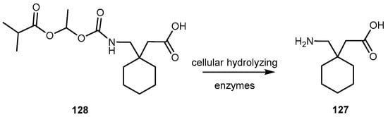 - Cundy, C.K.; Branch, R.; Chernov-Rogan, T.; Dias, T.; Estrada, T.; Hold, K.; Koller, K.; Liu, X.; Mann, A.; Panuwat, M.; et al. XP13515 [(±)-1([α-isobutanoyloxyethoxylcarbonyl]aminomethyl)-1-cyclohexane acetic acid], a novel gabapentin prodrug: I. Design, synthesis, enzymatic conversion to gabapentin, an a intestinal transport by intestinal solute transporters. J. Pharm. Ther. 2004, 311, 315–323. [Google Scholar] [CrossRef] [PubMed]
