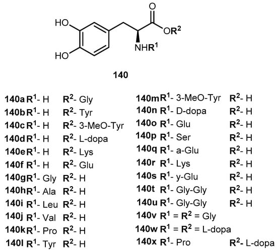 - Felix, A.M.; Winter, D.P.; Wang, S.S.; Kulesha, I.D.; Pool, W.R.; Hane, D.L.; Sheppard, H. Synthesis and antineserpine activity of peptides of L-dopa. J. Med. Chem. 1974, 17, 422–426. [Google Scholar] [CrossRef] [PubMed]
