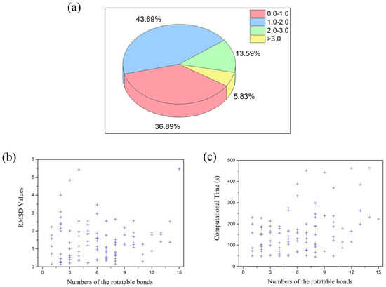 (a) The best RMSD values for the recruit of the ligands in those datasets. (b) The relationship between the numbers of the rotatable bonds and the best RMSD values for the recruit of the ligands. (c) The relationship between the numbers of the rotatable bonds of the ligands and the computational time.