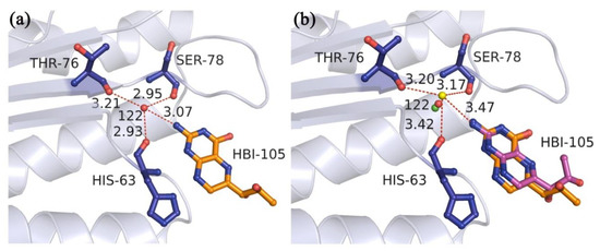 By way of illustration, let us take 1DCP (the crystal structure of DCOH, a bifunctional protein-binding transcriptional coactivator, complexed with biopterin) as an example. In crystal structure 1DCP (Figure 2a), the experiment-determined water molecule W122 (red sphere) played a significant role in simultaneously interacting with the nearby three residues HIS-63, THR-76, and SER-78 as well as the ligand atom. Thus, the W122 was treated as the key water molecule in the binding site. The original site of the optimized water molecule (green sphere) in the docking simulation was 0.54 Å away from W122. As the original sit was close to the experiment site of the water molecule, the optimization cost could be greatly reduced. After the optimizations, the best RMSD value for the recruit of the ligand in the multi-body docking simulations was 1.33 Å (Figure 2b), and only the rotatable bond of the ligand far away from the key water molecule had a small rotation. Additionally, the optimized water molecule (yellow sphere) was 1.21 Å away from W122. And it had the hydrogen bond interaction with the oxygen atoms of the same three residues HIS-63, THR-76, and SER-78 as well as the ligand. Due to the influence of the surrounding atoms of the proteins or the ligands, the key water molecules could be optimized to a reasonable site where they could form a more stable conformation by mediating the formation of the hydrogen bonds with the proteins or the ligands.
