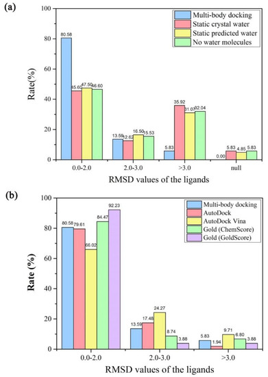 Four types of the protein-ligand docking simulations were performed for each crystal structure to determine the effect of the water molecules on the docking accuracy. For the evaluation criterion of the best RMSD values for the recruit of the ligands smaller than 2.0 Å, the multi-body docking program yielded the highest success rate of 80.58% in the datasets compared with the other docking approaches (Figure 3a). These results suggested that the docking accuracy was improved significantly by considering the fixed numbers of the key water molecules in the multi-body docking simulations. Normally, when the water molecules were included as a static part of the protein in the docking simulations, they may occupy a fixed space of the binding site, which led to a steric hindrance for the translation or the rotation of the ligands. However, when there was no water molecule in the docking simulations, it may lead to a lack of the mediation of the water molecules between the protein and the ligand, and was also not beneficial to the conformation stability. While for the key water molecules that would move instantaneously during the docking simulations, they could not only move to a reasonable space in the binding sites but also form a more stable conformation by mediating the formation of the hydrogen bonds with the nearby proteins or the ligands. Therefore, the multi-body docking considering the key water molecules as fixed-length optimization variables could achieve a higher success rate of the best RMSD values for the recruit of the ligands.
