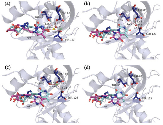 The cross-docking accuracy was investigated on the presence and absence of the key water molecules by four protein targets: purine nucleoside phosphorylase (PNP), cyclooxygenase 1 (COX-1), HIV reverse transcriptase (HIVRT), and estrogen receptor antagonist (ER agonist). These proteins were selected from the DUD-E [25] as they had previously been determined if the judicious selection of a common set of water molecules would still result in improvements in the docking accuracy across a set of different ligands [7,26]. In addition, five representative structures for each protein target [26] were also adopted here and their PDB codes are listed in Table 3. All structures were aligned with respect to the template structure and the water molecules which were observed in all binding sites of the complexes would be selected in the multi-body docking simulations. As can be seen from the results of all docking simulations in Table 3, the inclusion of water molecules significantly improved the results of the receptors of 1B8N, 2AI1, 2AI2, 1C1B, 1RT1, 1VRT, and 1GWQ. In the case of the receptor of 1B8N (Figure S2a,b), the water molecule occupied a deep and wide space of the binding site, where it could interact with the polar atoms of the surrounding amino acids and the ligand. Therefore, the inclusion of the water molecules improved the recruit of the ligand. However, the docking simulations on the presence of the water molecules gave few worse results than those without the water molecules for the receptors of 3FUC and 2OYE. In the case of the receptor of 3FUC (Figure S2c,d), there was a long and narrow protein pocket which might lead to the space limitation for ligand optimization. At the same time, the water molecules may increase the space hindrance, leading to the poor optimization results. On the other hand, the presence of water molecules significantly improved the results of the ligands of 1B8N, 1B8O, 2AI1, 2AI2, 1Q4G, 1RT1, 1VRU, and 1L2I. And the poor docking results were obtained for the ligands of 3FUC, 1IGZ, 2AYL, and 2IOG in both docking simulations. Also, take 3FUC as an example, the ligand of 3FUC presented a long linear structure and contained many rotatable bonds, thus might have a steric clash with the surrounding protein side chains and the water molecules in the narrow binding site. On the whole, the success rates (the best RMSD value for the recruit of the ligand was within 2.0 Å) of 56.00%, 36.00%, 68.00%, and 40.00% were achieved in the cross-docking simulations on the presence of the water molecules of PNP, COX-1, HIVRT, and ER agonist, respectively, which were higher than the rates of 28.00%, 32.00%, 48.00%, and 36.00% in the docking simulation without the water molecules.