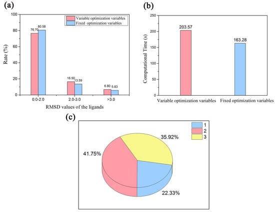 A comparison between the multi-body docking simulations considering the key water molecules as fixed-length optimization variables and variable-length optimization variables was conducted (The detail results are shown in Table S3). The same parameters were set in both the docking simulations. From the Figure 5a and Table S2 we can see, the success rates of the best RMSD values for the recruit of the ligands with an RMSD value smaller than 2.0 Å and the average RMSD values for the recruit of the ligands in the two docking simulations were approximately equal. Additionally, the overall computational time of the multi-body docking simulations considering the key water molecules as variable-length optimization variables was about 1.25 times to that of the multi-body docking simulations considering the key water molecules as fixed-length optimization variables (Figure 5b). Furthermore, the proportions of one, two and three optimized water molecules in all docked poses of the best RMSD values for the recruit of the ligands in the multi-body docking simulations considering the key water molecules as variable-length optimization variables were 22.33%, 41.75%, and 35.92%, respectively (Figure 5c).