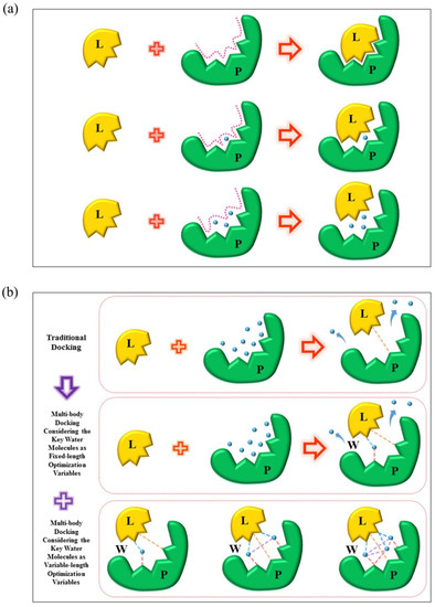 To solve the above-mentioned problem, we have designed the multi-body interactions model considering the numbers of the key water molecules as the optimization variables in docking simulations (Figure 7b). Different from the traditional molecular docking without the water molecules, this multi-body interactions model took into account the effect of the key water molecules in two separate ways: (i) the numbers of the key water molecules were included as fixed-length optimization variables, that is, the fixed numbers of the key water molecules would participate in the docking simulations; (ii) the numbers of the key water molecules were included as variable-length optimization variables, that is, the variable numbers of the key water molecules would participate in the docking simulations. Through the above measures, the multi-body interaction model of protein-water-ligand was designed.