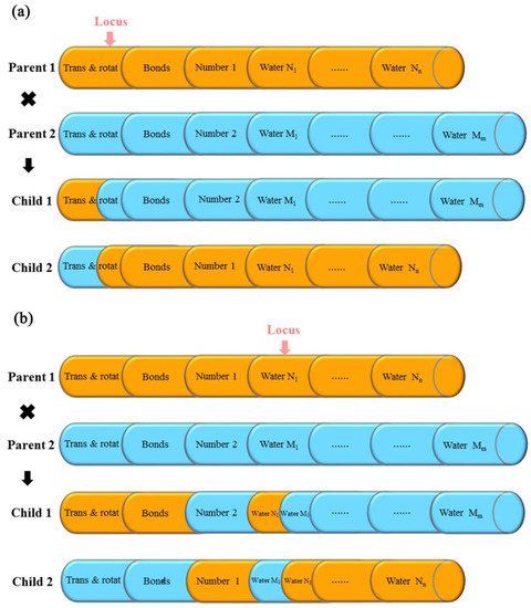 The mechanism of the unequal chromosome cross-over. (a) The operation of the unequal chromosome cross-over when the random gene locus sited on the degrees of freedom of the ligand. (b) The operation of the unequal chromosome cross-over when the random gene locus sited on the degrees of freedom of the water molecules. Trans and rotat stand for the state variables of the translation and rotation of the entire ligand, respectively; bonds stand for the state variables of the torsion angles of the rotatable bonds of the ligand; Number 1 and Number 2 represent the signs of the numbers of the water molecules; Water Nn (Water Mm) stands for the state variables of the translation of the number Nn (Mm) of the water molecule. Locus represents the random gene locus for the cross-over operation.