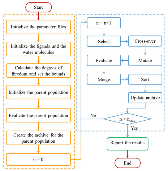 To obtain the optimal binding poses of the multi-body docking simulations, we designed a workflow that consists of several calculation and optimization steps, as shown in Figure 9. The multi-body docking approach was coded in C++, and the following parameters were adopted: the active sites included protein residues within a sphere with a radius of 20.0 Å centered on the center of the ligands in the experimental crystal structures [28]. For each NSGA II optimization run, 500 generations were performed on an initial population with a size of 2000, and the operator weights for cross-over and mutation were set to 0.9 and 0.1, respectively. Detailed results for the parameters comparison in NSGA II are shown in Appendix A (Supplementary Materials). Furthermore, the ranges of the translation and rotation of the ligands were set to ±4.0 Å and ±3.14 rad, respectively. And the range of the translation for the water molecules was ±2.0 Å.