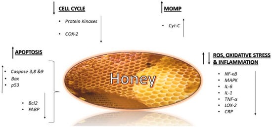 - Erejuwa, O.O.; Sulaiman, S.A.; Wahab, M.S. Effects of honey and its mechanisms of action on the development and progression of cancer. Molecules 2014, 19, 2497–2522. [Google Scholar] [CrossRef] [PubMed]