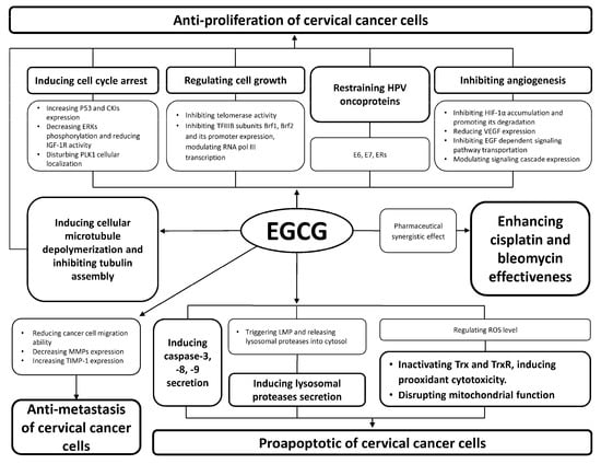 The mechanism of tumor progression is based on the proliferation and metastasis of cancer cells [28]. One of the characteristics in advanced malignancies is infinite proliferation of cancer cells. Inhibiting proliferation of cervical cancer cells could stabilize the symptoms of a patient and extend the treatment duration with higher curative potential. EGCG can reduce cervical cancer cell proliferation in various ways (Figure 1), including: (1) inducing cancer cell cycle arrest; (2) regulating cancer cell growth; (3) inducing cellular microtubule depolymerization and inhibiting tubulin assembly; (4) inhibiting angiogenesis; and (5) restraining HPV oncoproteins.