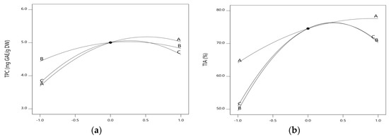The coefficients of each first-order regression equation provide a measure of the effect level of the independent variable on the response. The quadratic models (Equations (1) and (2)) showed that the linear terms of , , and were all positive and the three variables showed proportional effects on the responses (TPC and TIA). Therefore, this means that as the three dependent variables increase, the two independent variables also increase. An ANOVA of independent variables listed in Table 3 shows that the main variables, including extraction temperature (X1), extraction time (X2), and ethanol concentration (X3), were all significant (p < 0.05) and exhibited positive effects on TPC and TIA in the following orders of X1 > X3 > X2 and X2 = X3 > X1. The model’s goodness-of-fit was checked by determination coefficient (R2). The value of R2 closer to 1 denoted better correlation between the observed and predicted responses. An R2 value less than 80% indicates that the model does not sufficiently explain the relationship between the experimental variables [24]. In our models, the high R2 values, 0.9719 and 0.9638, for TPC and TIA, respectively, imply the experimental data confirm the predictability with the data predicted by the model.