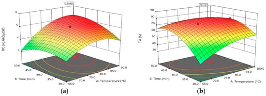 As shown in Figure 2a, the three dimensional response surface plot obtained from the RSM study shows the combined effect of extraction temperature and time on the actual TPC when ethanol concentration was kept constant at 61.3 v/v%. The maximum TPC could be obtained with an extraction temperature of 86.3 °C and extraction time of 46.4 min. The saddle point was found within the range of experiments, as two-way interaction variables were contributing to optimizing the extraction. The temperature increase in the extraction would destroy the extracted ingredient and it would be better to keep the temperature at 86.3 °C for the future TPC extraction experiments. Figure 2b shows the effect of extraction temperature and time on the TIA of the mealworm extract. The level of TIA increased with increasing extraction time and temperature. Then, it tends to decrease again after passing the maximum point. The maximum TIA of 78.3% could be predicted with extraction temperature of 86.3 °C and 42.4 min at a concentration of ethanol of 61.3 v/v%. According to Figure 2a,b, the increase in temperature improves the extraction of TPC because of the enhanced movement of molecules during solvent extraction at high temperature, as a result of higher diffusion coefficients and greater solubility of compounds. However, above a certain level of temperature and time, TPA and TIA tend to decline again, which is expected to be caused by a decomposition of bioactive materials at high temperatures [25]. Also, under a long extraction period, it could be because TPC and TIA of the mealworm extract have reached an equilibrium concentration during solvent extraction and further extracting could provide a chance for the exposure to heat, oxygen, and UV which enhances the degradation process of bioactive materials [26].