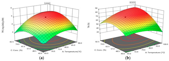 The effective way to evaluate the effect of the independent variables on the responses is to plot response surface curves, which was done by varying two variables within the experimental range while fixing one variable at the central point. To investigate the interactive effects of variables for the TPC and TIA values, three-dimensional plots were generated based on Equations (1) and (2) while keeping the concentration of ethanol fixed at 61.3 v/v%. The R2 values for the TPC and TIA models are very good, and the ANOVA table suggests that the models fitted well by first order (FO), two-way interaction (TWI), and second order (SO) terms. For both models the FO, TWI, and SO terms appear to be significant, but only the X2X3 term appears to be insignificant. Since the FO and TWI terms appear to be significant, the graph showed a linearity and a curved property for TPC and TIA.