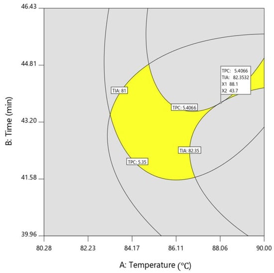 Because the optimal conditions of two responses are different, a superimposed contour plot was employed to optimize the extraction conditions for extraction temperature, time, and ethanol concentration to simultaneously obtain maximum concentrations of TPC and TIA. In our previous study, in order to apply a superimposed contour plot, one independent variable was set at a fixed level to evaluate the effect of the other two variables on dependent responses. Thus, a superimposed counter plot (Figure 4) for TPC and TIA as a function of temperature and extraction time was plotted, with the ethanol concentration fixed at the optimum level of 72.0 v/v%. The results showed that TPC of 5.41 mg GAE/g DW and TIA of 82.4% were predicted as optimum conditions under the extraction variables of extraction temperature of 88.1 °C, extraction time of 43.7 min. To verify the quality of the result obtained from RSM, the validation experiment was conducted in triplicate and compared with levels of TPC and TIA predicted under optimum conditions. The levels of TPC and TIA of the validation experiment were 5.6 ± 0.2 GAE/g dry weight (DW) and 79.6 ± 3.3, respectively. When the t-test was performed to assess the statistical significance of predicted and validation values, the difference between the two values was not significant with p = 0.143 and p = 0.5 for TPC and TIA, respectively, implying that no significant difference was found between validation and predicted values. It was shown that optimized hot-water extraction by statistical optimization was superior to Sohxlet extraction under the same conditions. Thus, the RSM used for the optimization of extraction conditions of TPC and TIA is a very useful tool for predicting the response values.