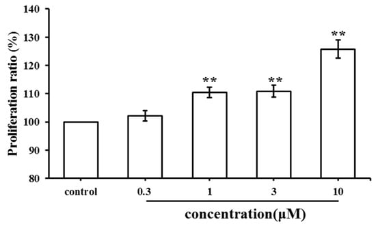 An MTT assay was used to evaluate the effect of SC on cell proliferation. The results were recorded as the proliferation ratio. As shown in Figure 2, SC promoted the proliferation of MC3T3-E1 cells in a dose-dependent manner. Higher doses of SC (1 μM, 3 μM and 10 μM) exhibited a significant stimulatory effect on MC3T3-E1 cell proliferation. The maximum stimulatory effect was achieved when SC was at 10 μM. However, no significant stimulatory effect was observed after treatment with 0.3 μM.