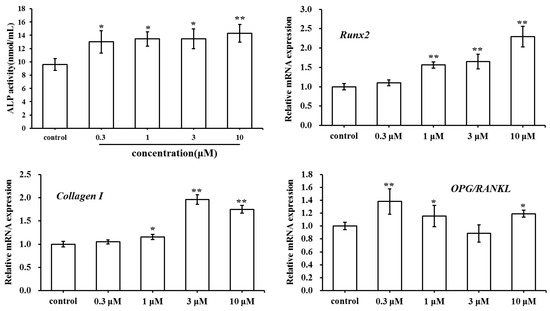 MC3T3-E1 cells were exposed to SC for seven days at various concentrations (0.3, 1, 3 and 10 μM). Alkaline phosphatase (ALP) is a phenotypic marker of osteoblastic differentiation. As shown in Figure 3, SC treatment produced a higher ALP activity than the control. SC at 10 μM increased ALP activity significantly (p < 0.01 vs. control). By contrast, Runx2 and Collagen I as osteogenic genes were upregulated in the SC-treated group. At the same time, the ratio of OPG/RANKL increased when compared to the control group. These results suggested that SC could promote osteoblast differentiation and also suppress osteoclast growth simultaneously.