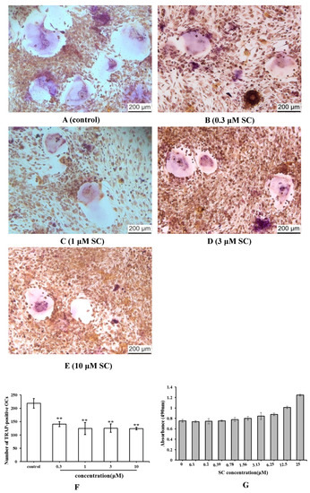 Effect of SC treatment on osteoclast formation (** p < 0.01 compared with the control group). (A–E) TRAP staining images (×100). (F) The number of TRAP-positive multinucleated OCs. (G) Cell viability assay.