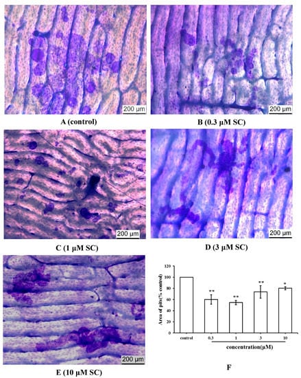 The bone resorption pits formed by rabbit osteoclasts after eight days of incubation (* p < 0.05, ** p < 0.01 compared with the control group). (A–E) Pits on the bone slices stained with toluidine blue (×100). (F) The ratio of pits area the SC group and the control group.