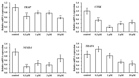 Effects of SC treatment on the relative mRNA expression levels of TRAP, Cathepsin K (CTSK), NFATc1, and TRAF6. * p < 0.05, ** p < 0.01 compared with the control group.