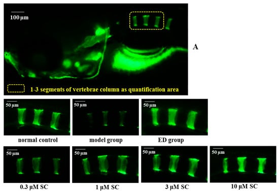 Synchronized embryos at the age of 3 dpf were placed into a six-well plate. Zebrafish larvae were then exposed to 75 μg/mL prednisone and different concentrations of SC (0, 0.3, 1, 3 and 10 μM). In the positive control group, zebrafish were treated with 300 μg/mL etidronate disodium, which is a bone resorption inhibitor. At the same time, zebrafish only treated with medium solution were served as a normal control group. All these groups were incubated at 28 °C until 8 dpf. The medium solution was changed every other day.