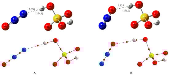 As displayed in Table 3, the calculated interaction energies between H2SO4 and N2O are −2.14(−2.72) and −2.77(−4.22) kcal/mol in complexes A and B, respectively, where the data in parentheses refer to the results at the CCSD(T)/AUG-cc-pVTZ level of theory. As a result, complex B is more stable than complex A by 0.76 (1.72) kcal/mol, which is in agreement with the larger H-bond in complex B.
