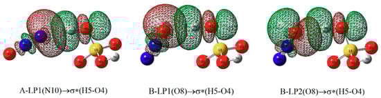 According to the NBO analyses, the O4-H5 bond of H2SO4 participating in the H-bonds should be elongated due to the electron transfer from the lone pairs of the proton acceptor to the σ* orbital of the proton donor. As a result, compared with the isolated state, the O4-H5 bond of H2SO4 has been elongated by about 0.006 and 0.008 A, respectively. Correspondingly, as shown in Figure 4, red-shifts of 115 and 152 cm−1 occur for the vibrational frequencies of the O4-H5 bond in complexes A and B, respectively. Moreover, the characteristic absorption peaks at 3650.0 and 3612.8 cm−1 are originated from the stretching vibration of the O4-H5 bond of H2SO4 fragment in complexes A and B, providing the direct spectra proof for the existence of intermolecular H-bonds. For the sake of reference, the detailed IR results including peak positions and intensities have been given in Table S1 of the Supplementary Material (SM).