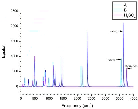 Calculated IR spectra of complexes A and B as well as H2SO4.