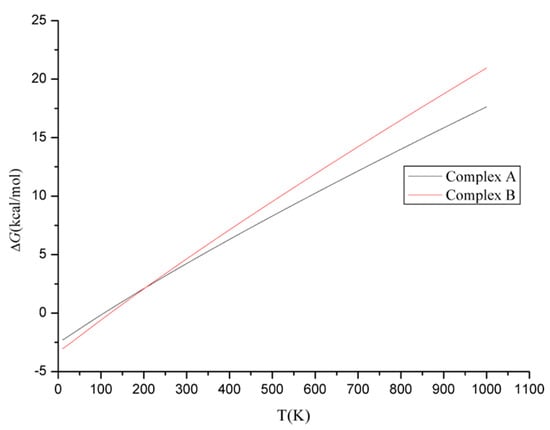 The dependence of ΔG on temperatures in the formation process of complexes A and B.