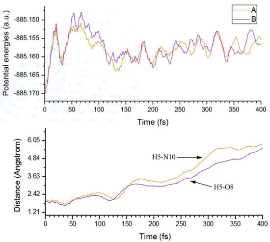To further explore the dynamic stability of the complexes A and B, molecular dynamics simulations have been performed on the basis of their optimized geometries. The time evolution of the potential energy and the H-bond in both complexes have been given in Figure 7. On the one hand, both intermolecular H-bonds in complexes can still be observed during the initial stage of the dynamics simulation, indicating that the complexes can exist in a short period of time. On the other hand, the intermolecular H-bonds disappear with the evolution of the simulation time, implying the instability of the complexes. Therefore, complexes A and B can exist transiently within a certain period of time.