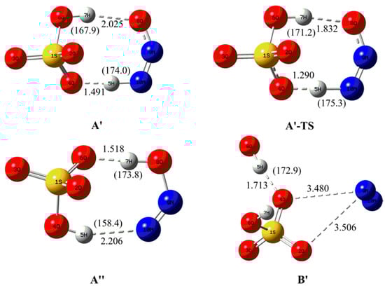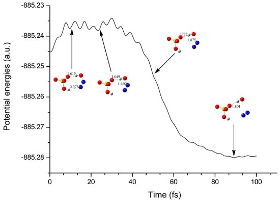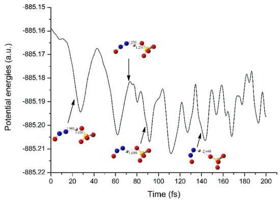 Moreover, as mentioned above, complex A′ can be transformed into complex A′′ easily. To further explore the dynamic stability of complex A′′, molecular dynamics calculations have been carried out based on its optimized geometry. As displayed in Figure 12 and Figure S3 of Supplementary Materials, the N-O bond of HONN fragment has been elongated gradually with the evolution of simulation time. At 60 and 90 fs, the N-O bond has been elongated to 2.128 and 2.950 A, respectively. Therefore, complex A′′ is unstable and can be further transformed into OH radical, N2, and HSO4− fragments.
